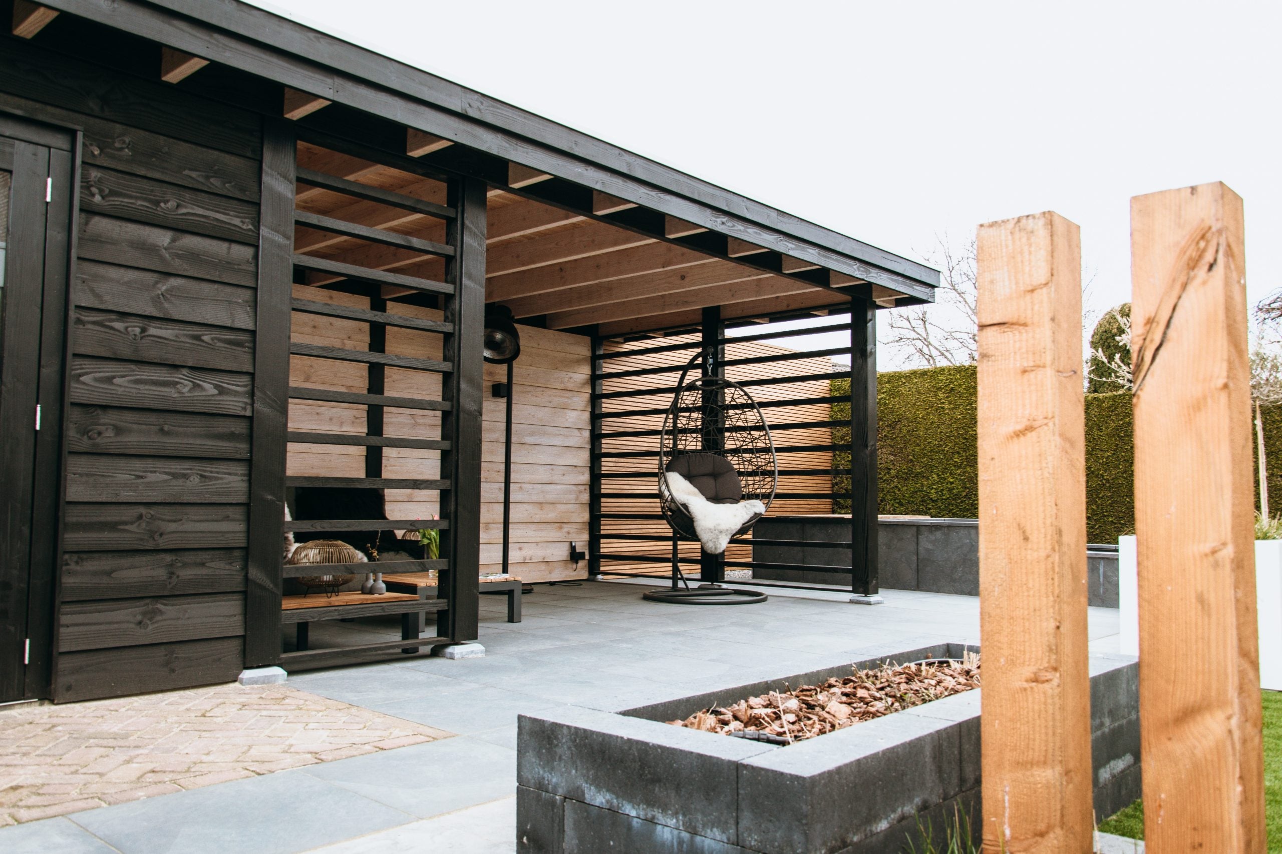 Houten buitenverblijf met platdak op maat.