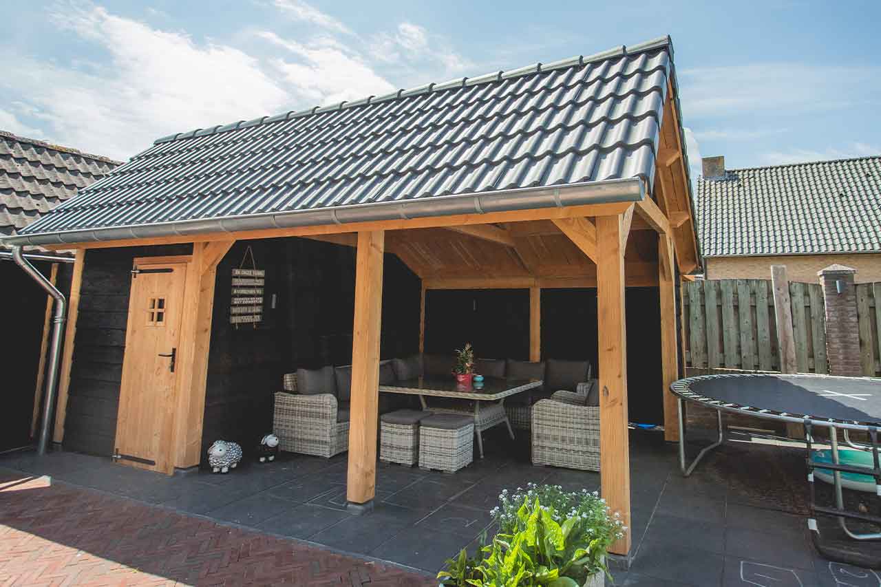Breid je houten tuinhuis uit met een overkapping. Zo staan je eigendommen altijd beschermd tegen de zon en/of de regen. Ook is het heerlijk loungen voor het hele gezin onder het afdak. Neem contact met ons om de mogelijkheden te bespreken om jouw tuinhuis uit te breiden met een houten overkapping.